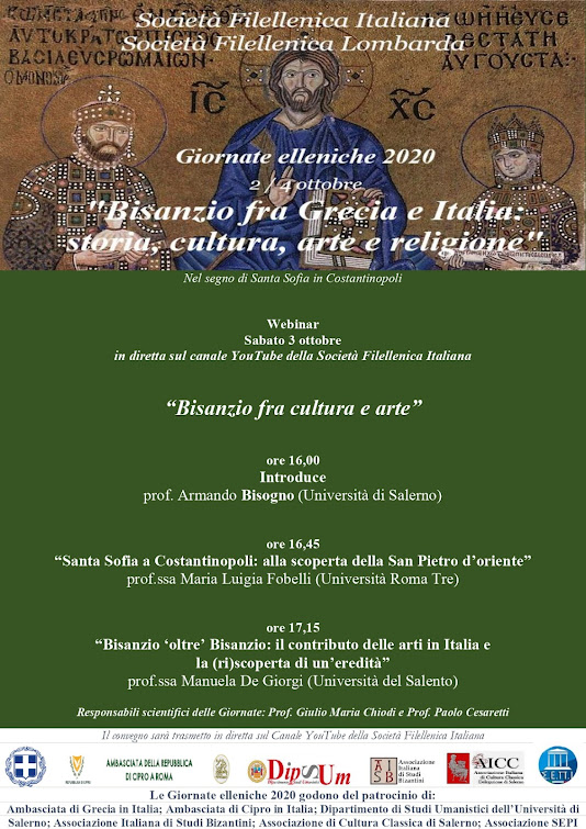 Si segnala con molto piacere che ai patrocini iniziali si è aggiunto anche quello prestigiosissimo dell'Università di Bergamo, grazie all'intercessione del Prof. Paolo Cesaretti, bizantinista, socio onorario della Società Filellenica Lombarda, nonché co-responsabile scientifico delle Giornate Elleniche.
